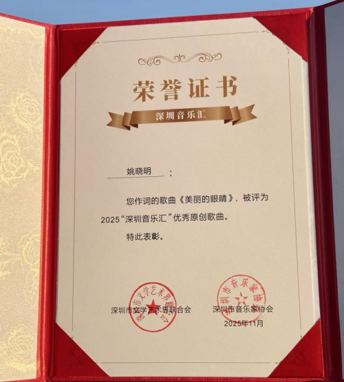 11月15日晚7点,由深圳市文学艺术界联合会主办,深圳市音乐家协会、深圳广电集团民生服务传播中心承办的“深圳音乐汇·2025深圳原创歌曲演唱会”于深圳人才公园·潮汐广场隆重举行。此次演唱会汇聚了众多优秀原创音乐作品,其中,由深圳华厦眼科医院特聘专家姚晓明博士作词的歌曲《美丽的眼睛》荣获2025“深圳音乐汇”优秀原创歌曲荣誉。
