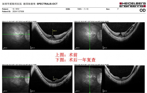 经详细检查,赵教授确诊容阿姨右眼同时患有高度近视黄斑前膜、黄斑劈裂、黄斑板层裂孔等多种病症,必须进行微创玻璃体视网膜手术治疗来松解黄斑组织所受到的持续牵拉,防止高度近视全层黄斑裂孔及进一步视网膜脱离的发生。